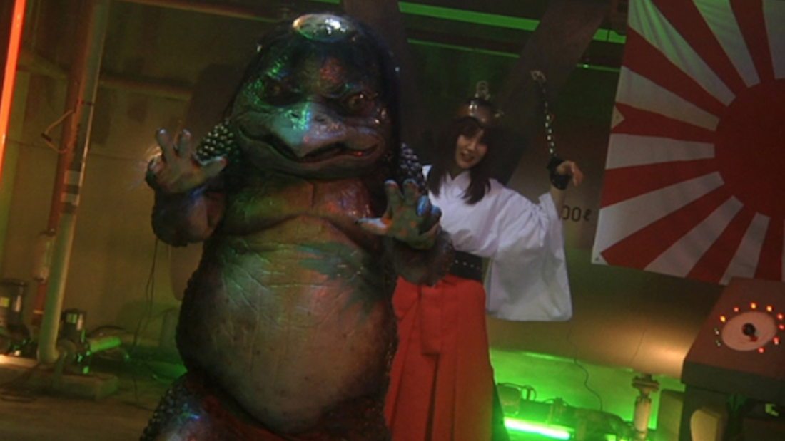 In the wake of the explosion, we cut to a city under attack by a kaiju. It treats the place like its own personal playground of destruction and quickly renders the Self Defense Force powerless. All hope seems lost until the kappa, now mutated into a giant from the atomic blast, takes it down in a face off that feels ripped right from Monday Night RAW. In an odd twist—which is saying something—the kappa then goes on a rampage setting its violent impulses on the very city it just saved.