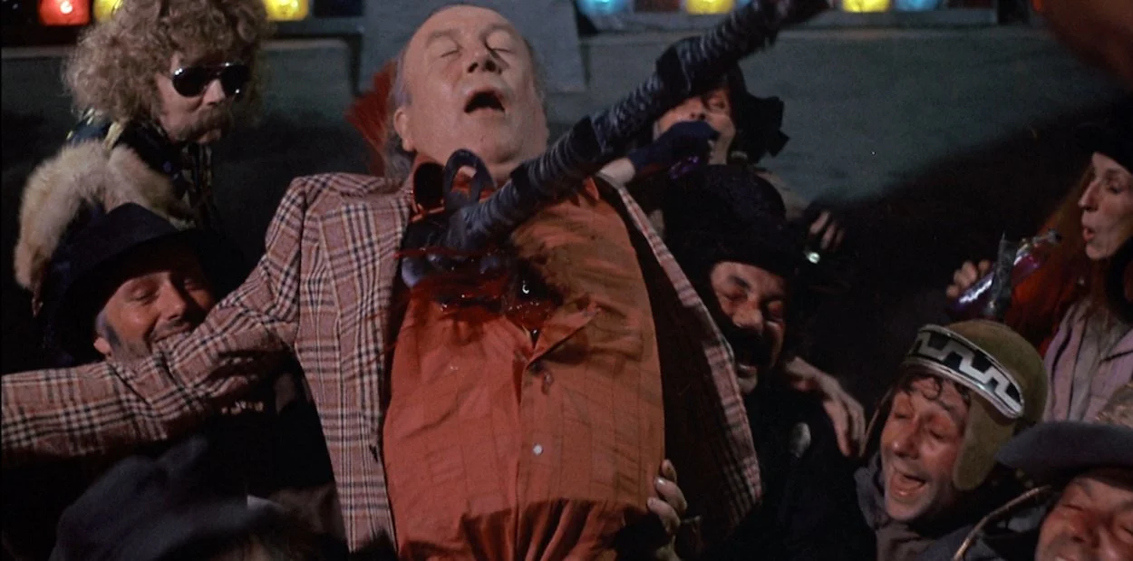 By the time you realize the tides have turned on George Maxwell (Michael Horden), it’s already far too late for him. The contentious critic wasn’t someone to root for, as he is only too eager to poking and prodding at “squatters” who have taken up space in an empty tenement he owns (and plans to tear down). When those seemingly drunk homeless people drop their act, the change in mood is swift—this man is about to die and somehow, it’s personal. When he starts to back up, he looks for any friendly faces among those he just judged as unworthy. He finds none and gets stabbed repeatedly as he’s crowded against a clear tarp directly mirroring Julias Caesar’s stabbing—which is nicely and directly called out with the inclusion of a Julius Caesar poster shortly after the first death scene. That is one of the great things about THEATRE OF BLOOD: it isn’t hiding its homicidal adaptations of Shakespeare. This movie wears its camp on its sleeve and knows it can deliver its diverse set of deaths in creative ways.