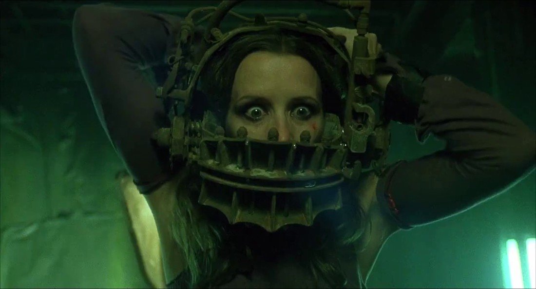 HOW IT WORKS: A woman strapped to a seat has her long hair fed through a winch that’ll continue to tighten until she is scalped. The trap is activated when a mask is pulled off the victim, pulling a metal pin attached to it from the machine. The combination to the lock that’ll free the woman is written on the gears on the back of the machine.