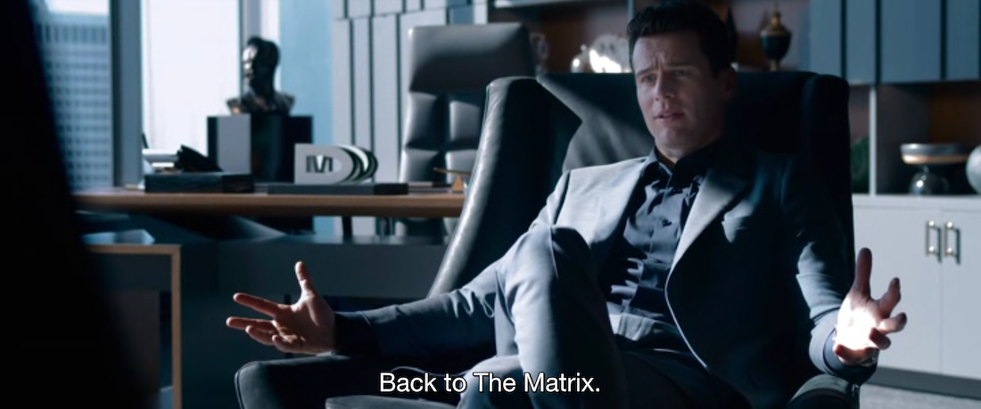 Here's the thing about feelings. They're so much easier to control than facts. Turns out, in my Matrix, the worse we treat you, the more we manipulate you, the more energy you produce. It's nuts. I've been setting productivity records every year since I took over. And, the best part, zero resistance. People stay in their pods, happier than pigs in shit. The key to it all? You. And her. Quietly yearning for what you don't have, while dreading losing what you do. For 99.9% of your race, that is the definition of reality. Desire and fear, baby.”